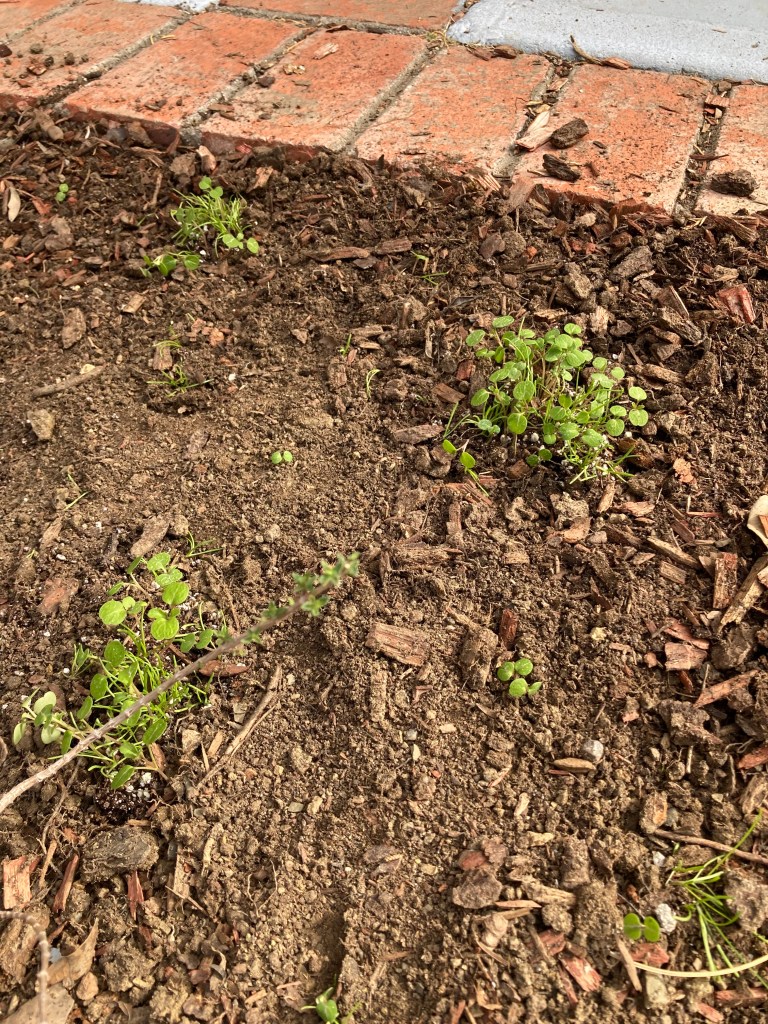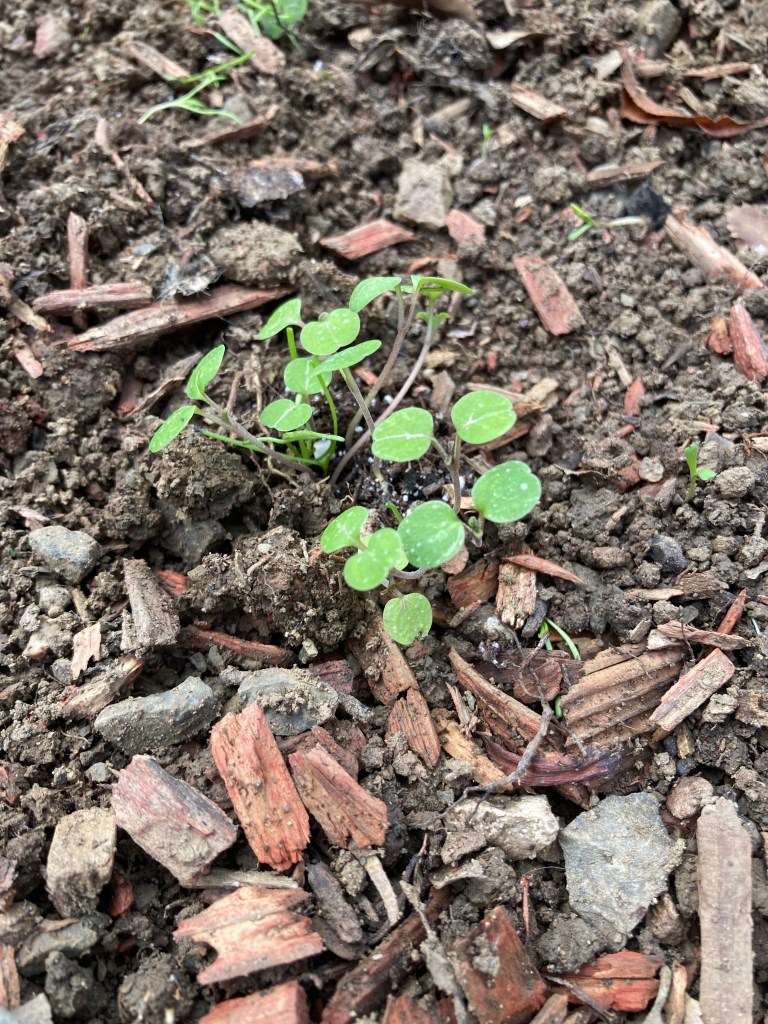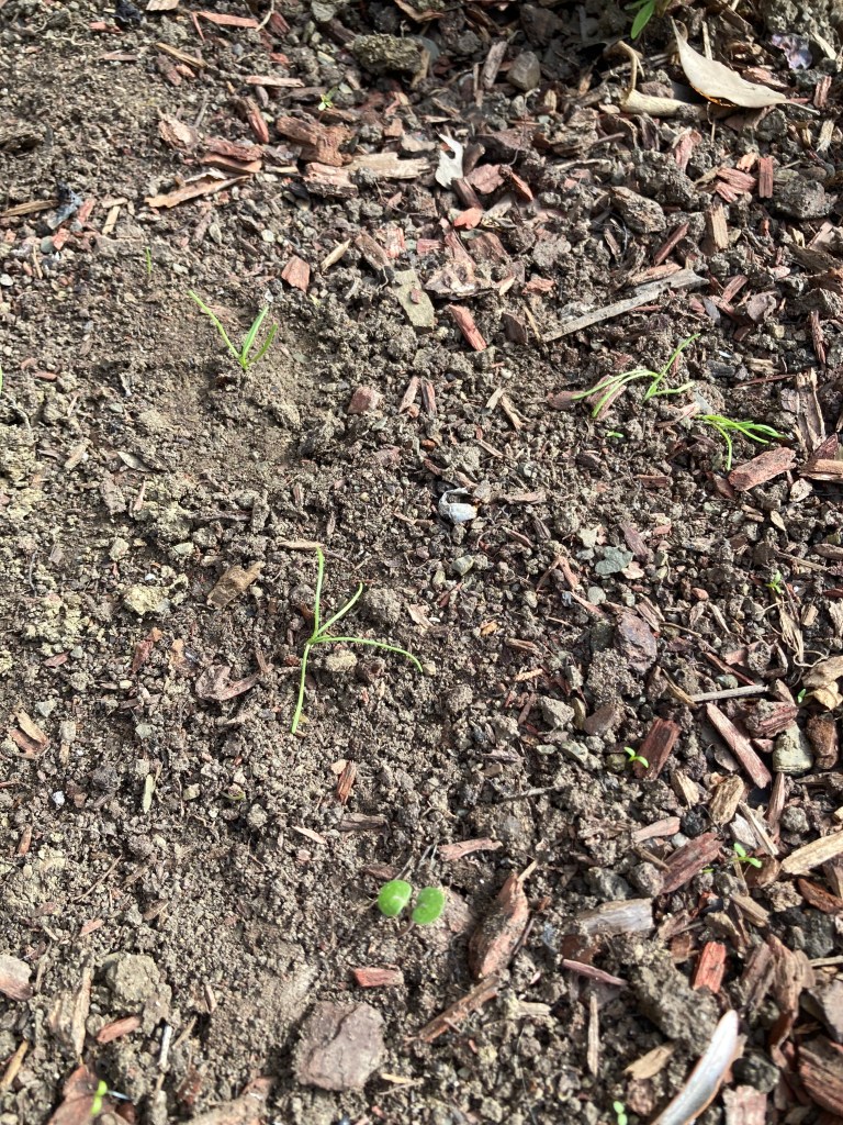 So, while in my pajamas and enduring a racking cough, I spent an hour digging tiny holes around the yard this morning and placing baby seedlings in the ground, sometimes one by one.